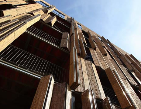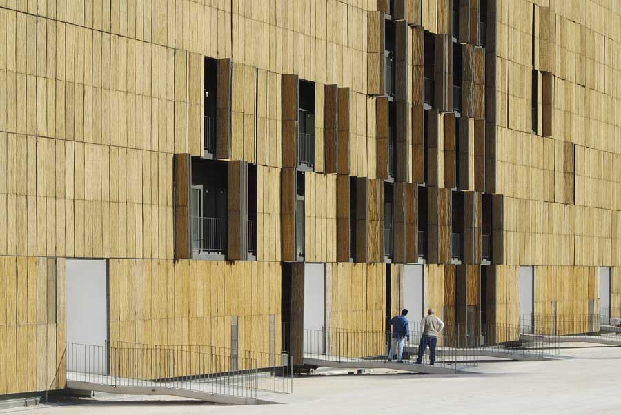 The bamboo box is housing project designed by Alejandro Zaera Polo. He is a Spanish architect based in London and has being a architectural tutor at on of the most prestigious international schools of architecture, the Architectural Association. His studio is well known for designing the Yokohama Port Terminal. The material he has used in the facade is bamboo. The different two and three bedroom typologies are ”pasantes”, ie. all have both east and west orientations resulting in very long pieces that can be easily identified in the floor plans.