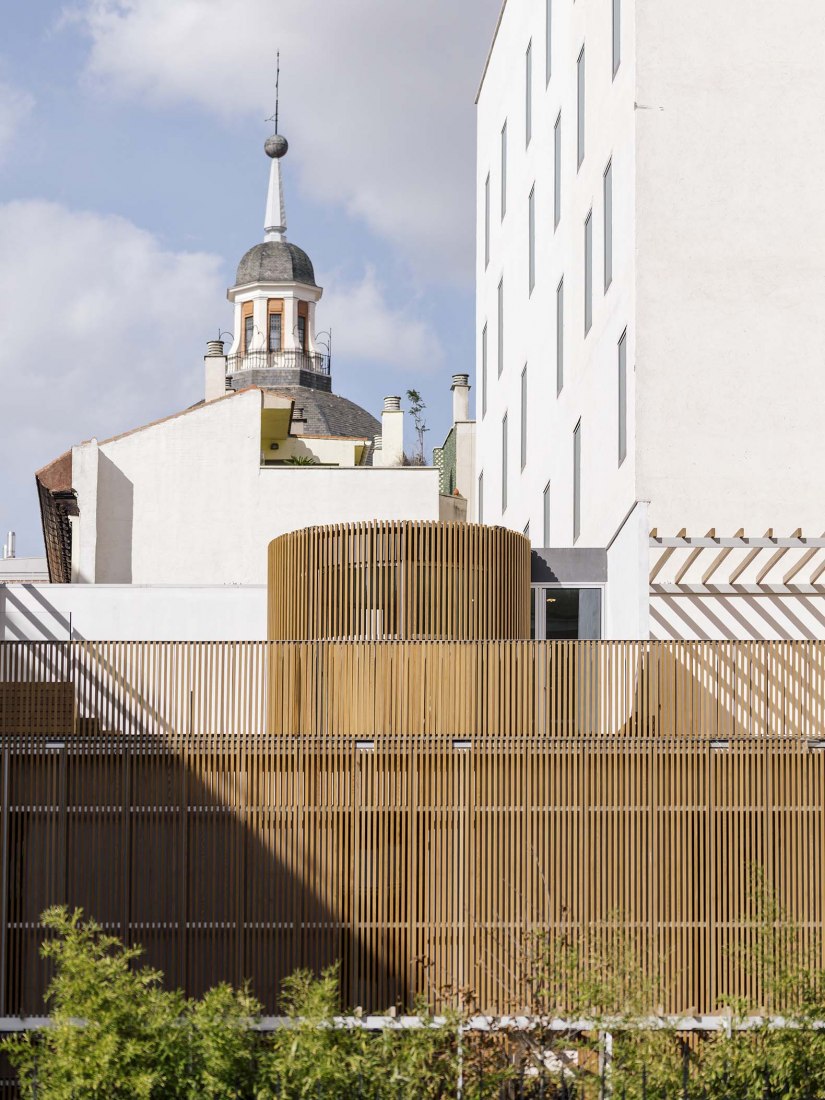 However, towards the interior, a lighter and more friendly façade opens onto the garden through large glass panels covered with a wooden lattice. A low volume in the form of a house on two heights closes the garden, giving the built complex a human scale.