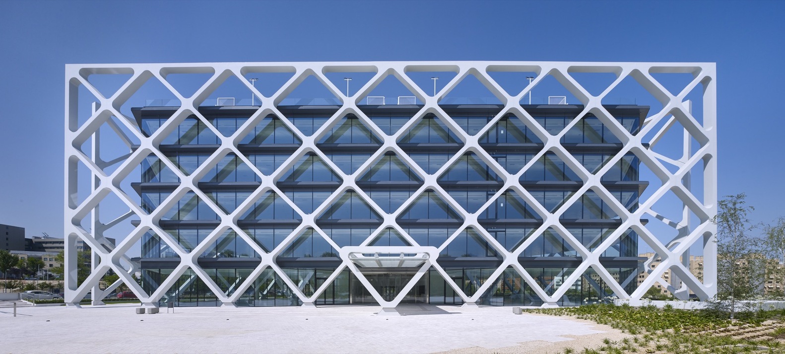 A whole new complex that integrates several pre-existing buildings on site that were in a good condition. Around are buildings are unified by a linear continues facade that is a very original compositions ir irregular, still “aerodinamic” brise-soleis. This is a solar protection system of beautifull aesthetics.